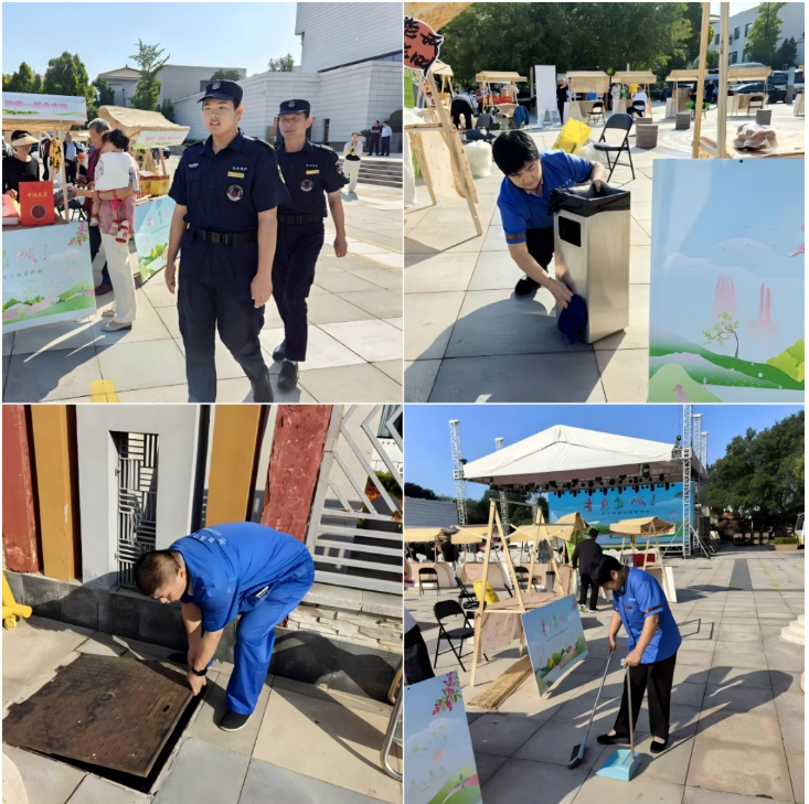 市集服務(wù)見真章,煙火氣里守規(guī)范。室外非遺市集熱鬧非凡,寧陽大棗制品、傳統(tǒng)糕點(diǎn)等特色美食香氣四溢。項(xiàng)目提前規(guī)劃攤位動(dòng)線,增設(shè)垃圾桶10余組,保潔團(tuán)隊(duì)采用“即時(shí)清掃 + 定點(diǎn)值守”模式,確保油污雜物隨產(chǎn)隨清。工程人員定時(shí)巡查攤位用電用水安全,為商戶提供臨時(shí)儲物、應(yīng)急供水供電等服務(wù)。秩序維護(hù)團(tuán)隊(duì)針對高峰時(shí)段,快速啟動(dòng)單向通行疏導(dǎo)方案,保證市民朋友有序、舒適的逛集體驗(yàn)。