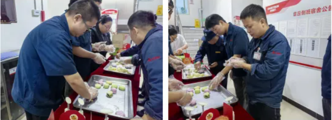 為讓重汽集團(tuán)住宿職工更深度體驗(yàn)節(jié)日氛圍,當(dāng)天下午,“巧手月餅DIY”活動在宿舍區(qū)歡樂開啟。活動通知一經(jīng)發(fā)布,便吸引了眾多職工踴躍報名。傍晚六點(diǎn),活動現(xiàn)場已是人頭攢動,歡聲笑語不絕于耳?,F(xiàn)場布置喜慶溫馨,操作臺上整齊擺放著由食堂提前備好的面團(tuán)、豆沙、蓮蓉等多種餡料,以及各式精美的月餅?zāi)>摺T谡J(rèn)真了解從和面、分劑、包餡到壓模、烘烤的制作步驟后,大家迫不及待地動手實(shí)踐,現(xiàn)場氣氛熱烈,笑聲此起彼伏。忙碌一天的職工們此刻圍聚在一起,互相交流制作技巧,分享工作與生活趣事,連心物業(yè)工作人員也用鏡頭記錄下一個個溫馨快樂瞬間。經(jīng)過大家巧手制作,一個個造型精美的月餅逐漸成形,滿滿的成就感與節(jié)日的喜悅洋溢在每個人的臉上。